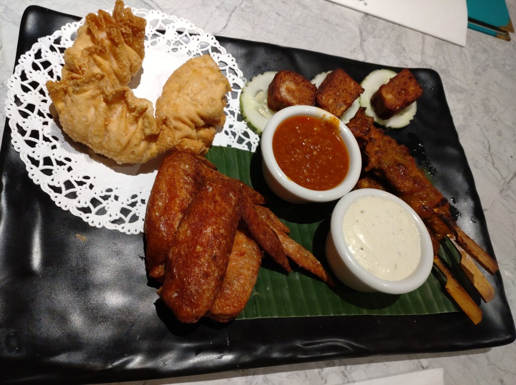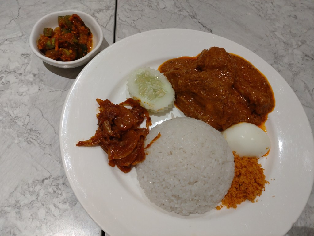 We had intended to start the afternoon off with a plate of Madam’s Starter for 2 – which included three each of chicken satay, otak-otak (fish cake), deep-fried dumplings and chicken wings (MYR 33.90). However, the starter arrived much later – a long time after the two nasi lemak dishes were served. In fact, we noticed a similar situation at the neighbouring table, where the nasi lemak was served almost as soon as it was ordered, but the second diner’s meal came after the first had already finished their nasi lemak. Anyway, coming back to the starter – the satay was good, albeit a bit oily. It already had some peanut sauce on it. My favourite of the lot was the fried dumplings, which went very well with the mayo dip that came with the dish. The fish cakes tasted good, too, although a bit oily again. The chicken wings were nicely seasoned, and the sweet chilli sauce provided went well with both of the latter.