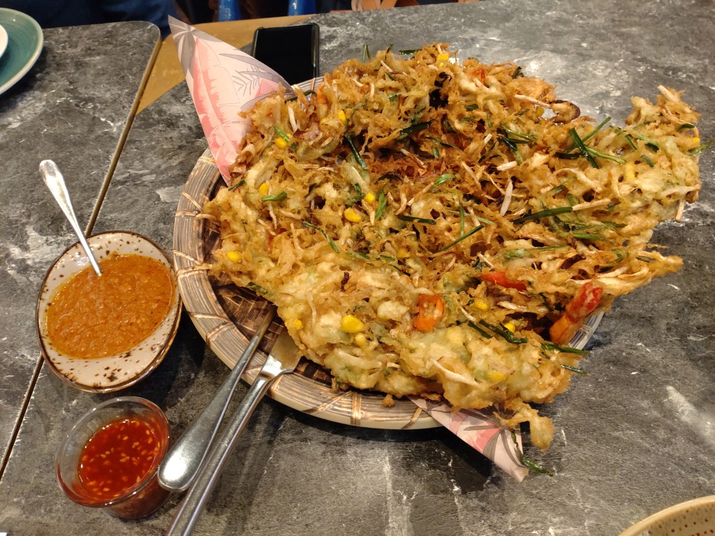 We tried their Cucur Udang appetiser – deep-fried tiger prawns, dried shrimps, bean sprouts and chives (MYR 28.00). This was a chef’s recommendation and came in the form of what looked like a giant, intertwined pakoda. The accompanying peanut sauce was great, but the appetiser itself was quite oily and had just about a couple or more of the tiger prawns that we were looking forward to enjoying. The oiliness meant that one could only consume a limited quantity of the appetiser.