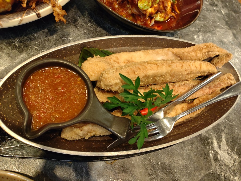 The second dish was Masam Manis (another chef’s recommendation) – deep-fried seabass fillet (MYR 78.00). The menu description mentioned being “generously doused with sweet and sour tamarind sauce until dry and fragrant”. I’m not sure how exactly this was meant to translate onto the plate as the fish fillets didn’t appear to be or taste like they had been doused in sauce. However, the accompanying sauce was quite good. Perfectly balanced, and made this dish the tastiest of the night. The fish itself was nicely seasoned, too.