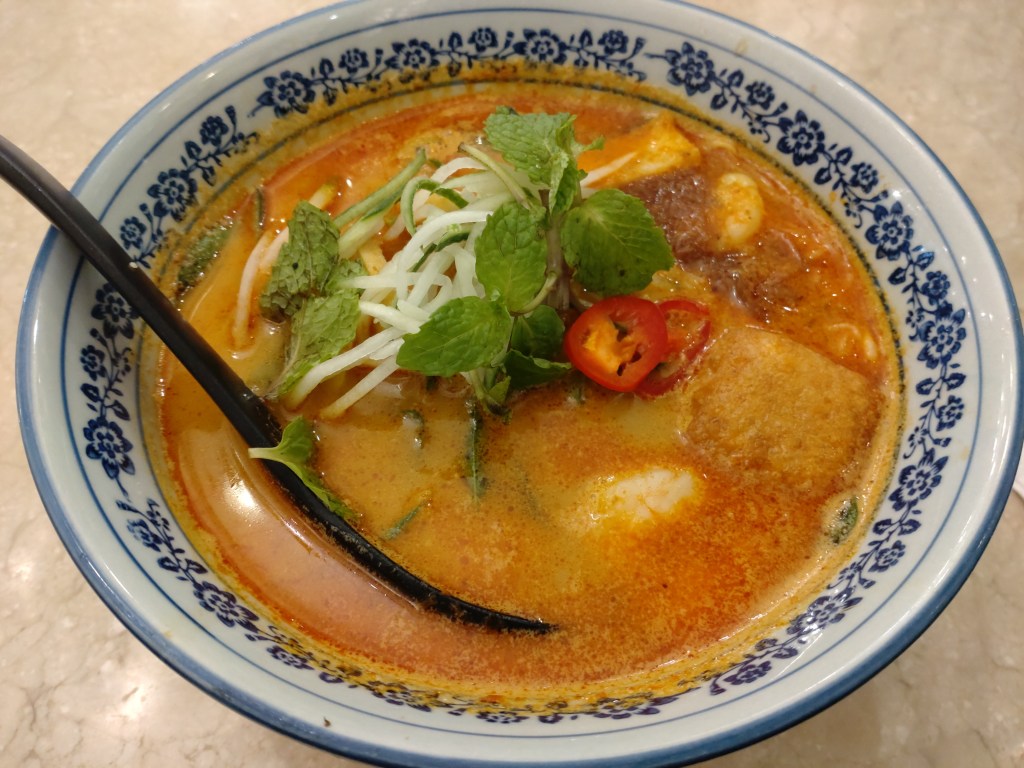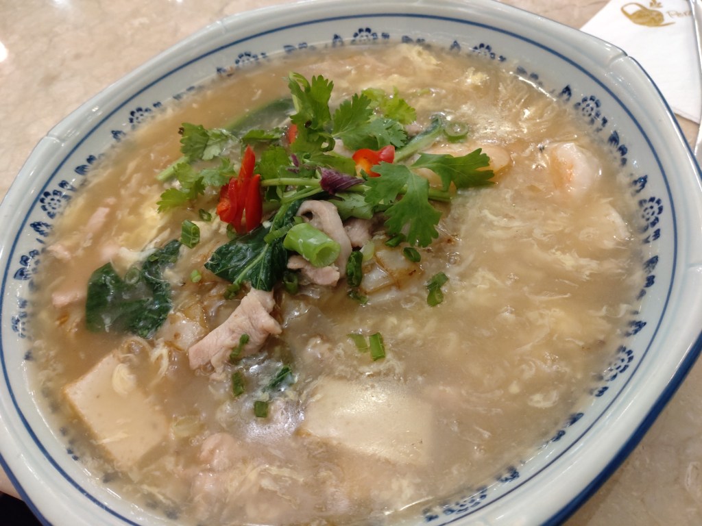Their Cantonese Fried Noodles – a mix of kuey teow (rice noodles) and yee mee (egg noodles) with vegetables, prawns and sliced chicken (MYR 15.90) unexpectedly came in a sort of egg-drop soup as well. And this was delicious, too. Obviously less spicy than the laksa, but so full of flavour – more than we expected – and, again, with plenty of everything that the menu promised. This place certainly dished out food for both belly and soul!