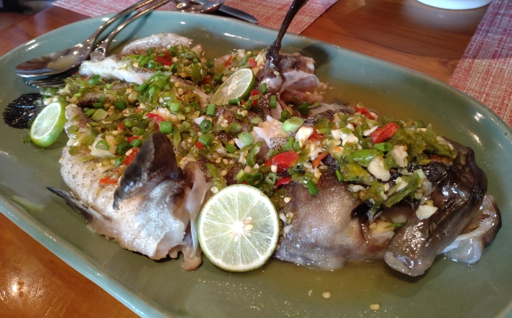 We picked their Pla Gao Nueng Manao – steamed grouper whole fish with lime and chilli dressing (LKR 5,350). This is one of our favourite styles of having steamed fish, and this dish definitely did not disappoint with its tangy, mouth-watering dressing and perfectly steamed fish.