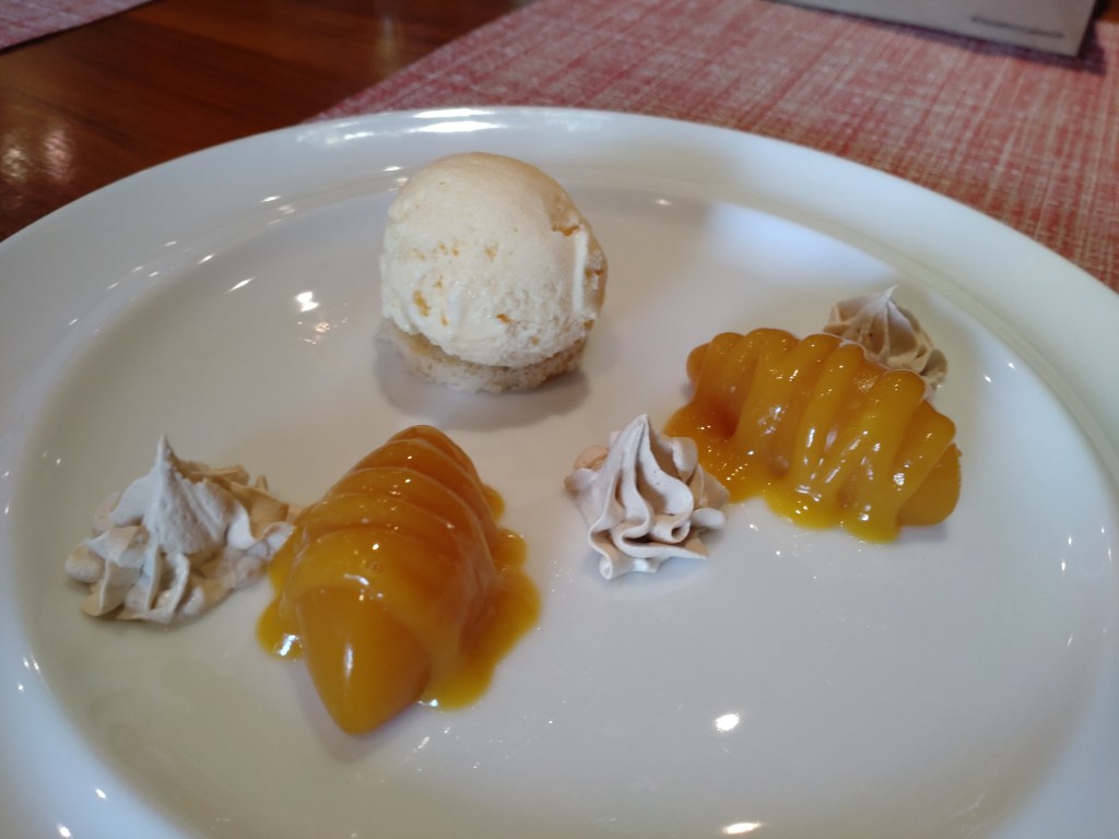 The second dessert, Mango Pudding (LKR 1,400) had an interesting flavour combination of mango pudding topped with mango sauce, and coffee cream. I don’t recall having tasted this combination before, but found it to be interesting in a decent way. This, too, had a scoop of vanilla ice cream on a disc of sponge.