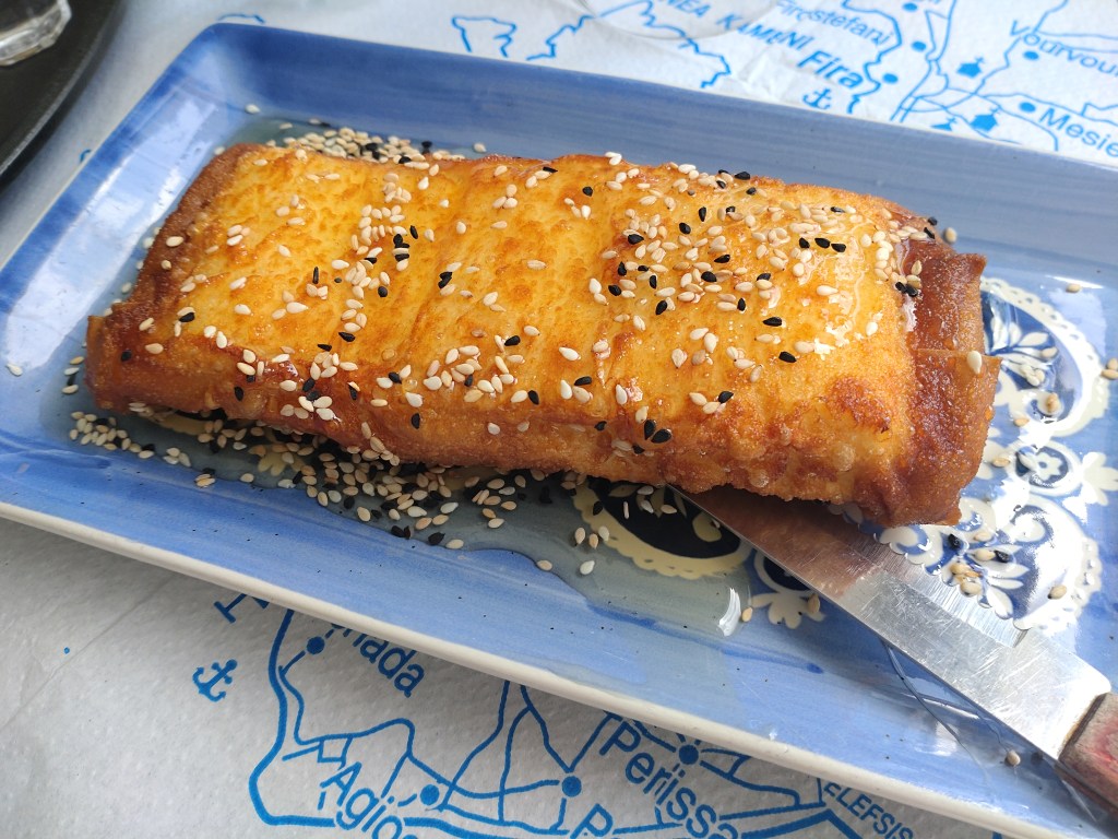 Feta me meli is a divine appetiser! Perfect for someone like me who loves cheese and honey. It is essentially a thick slice of feta cheese baked or fried inside a covering of filo pastry until crisp, and topped with toasted sesame seeds and a generous drizzle of honey. How/why I had never come across this delight before, I have no idea. But now that I have, I’m definitely an advocate for it! It’s the perfect balance of crispy and soft, salty and sweet, light and indulgent.