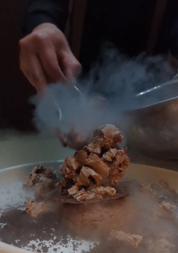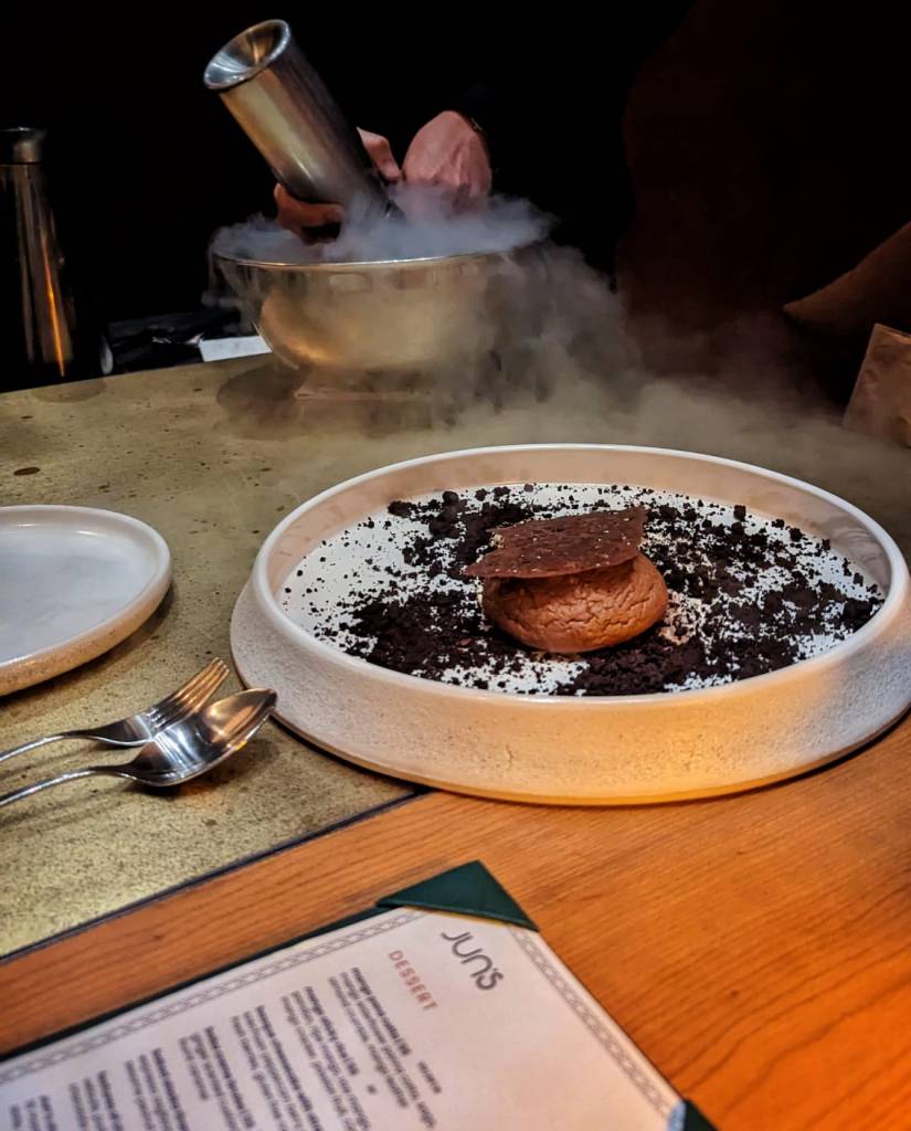 From their dessert menu, we tried the seemingly popular Textures of Chocolate (AED 65), which was a mix of velouté, pudding, mousse, chocolate soil and chocolate rocks. The dessert arrived with its fair share of liquid nitrogen theatrics. And it’s certainly not something for the faint-hearted. If you’re someone who prefers sweet, chocolatey desserts, this might not be up your alley. For it is strongly cocoa-based, with barely any sweetness to it. This dish, as its name suggests, is all about a myriad of textures that are created from chocolate by itself.