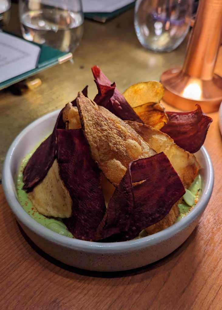 One of our picks from their ‘cold littles’ on the dinner menu was the Edamame Hummus (AED 55). This was refreshingly good, arriving in the form of a smooth, bright green dip with root vegetable crisps to enjoy the hummus with. Subtly refreshing and very pleasing on the palate.
