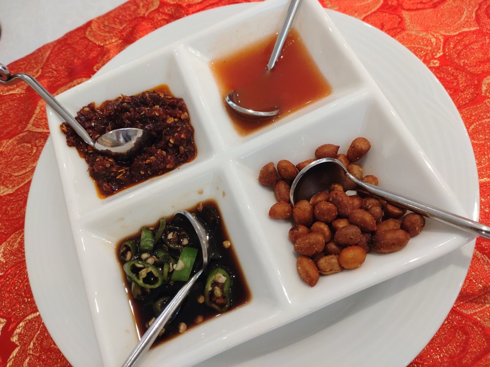 Their attractive condiment tray included a variety of chilli sauce, chilli flakes in oil, green chilli in soy sauce, and salted roasted peanuts.
