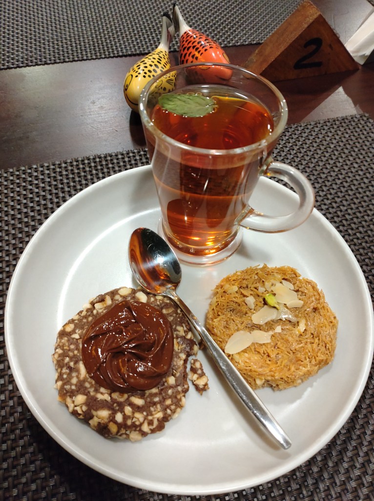 For dessert, we tried their Mint Suleimani with Baklava and Hazelnut Cookie (LKR 1,100), which was an interesting combination. The baklava was a biscuit-like derivative of a bird’s nest baklava with a bit of flaked almond and pistachio on top. It was a nice accompaniment for the tea, although not a conventional baklava. The hazelnut cookie was not very sweet – which is a good thing, and had plenty of chopped hazelnut in it. But it was mostly the gooey Nutella swirl on top that brought it to life. The tea was fine, not too strong, and with a nice mint hint. A good palate cleanser at the end of the meal.