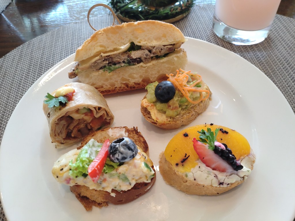 On the next plate, we’ve got a smoked chicken and mushroom ciabatta (top), an absolutely fabulous and juicy pork wrap (center left), a smooth and delicious avocado and carrot combo on wholemeal toast (center right), egg on toast (bottom left), and a satisfyingly good cream cheese and apricot mix on toast (bottom right). That center row there – so good!