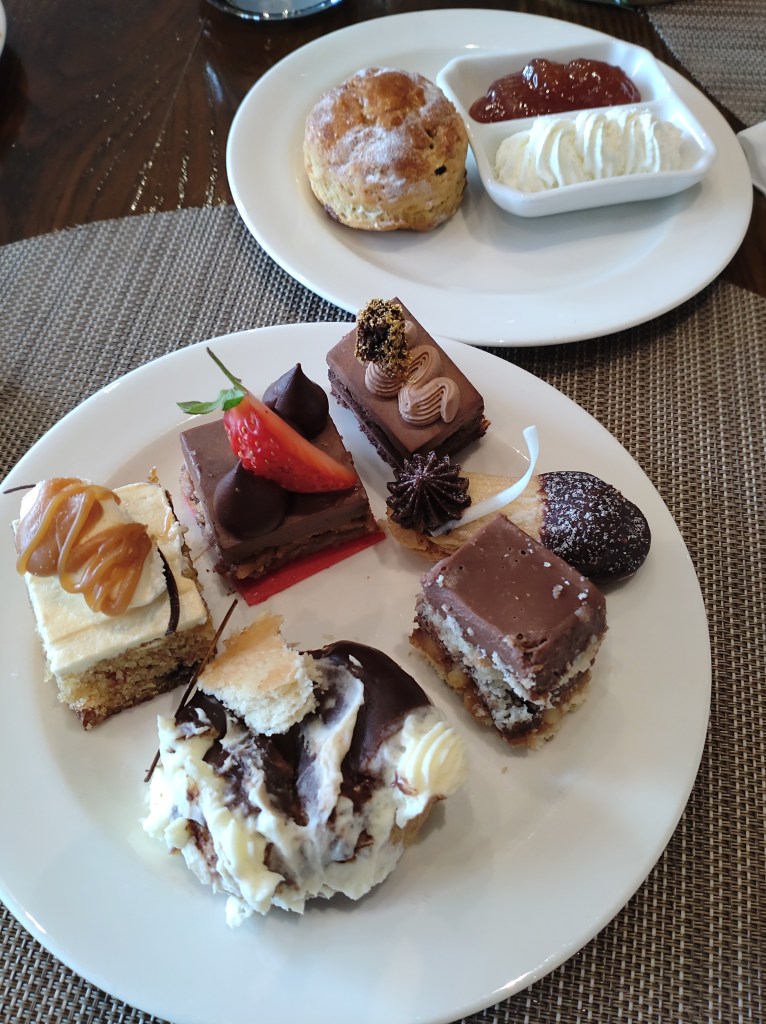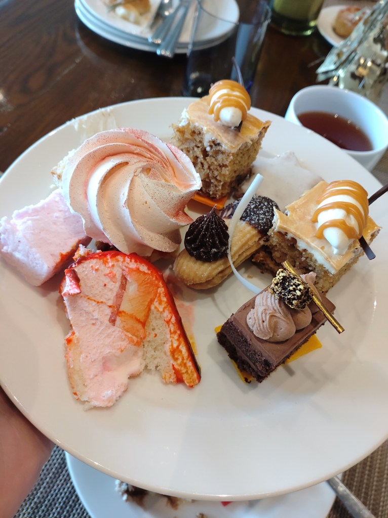 The sweet section involved an array of chocolate and hazelnut treats – guaranteed winners, a lovely salted caramel toffee cake, lychee and rose water cake, Viennese finger biscuits, scones with jam and clotted cream, a few good-looking cakes and bakes, a chocolate fountain and the likes. A selection of hot teas and coffee were available as well.