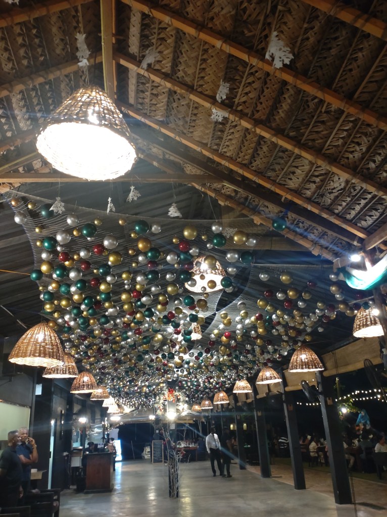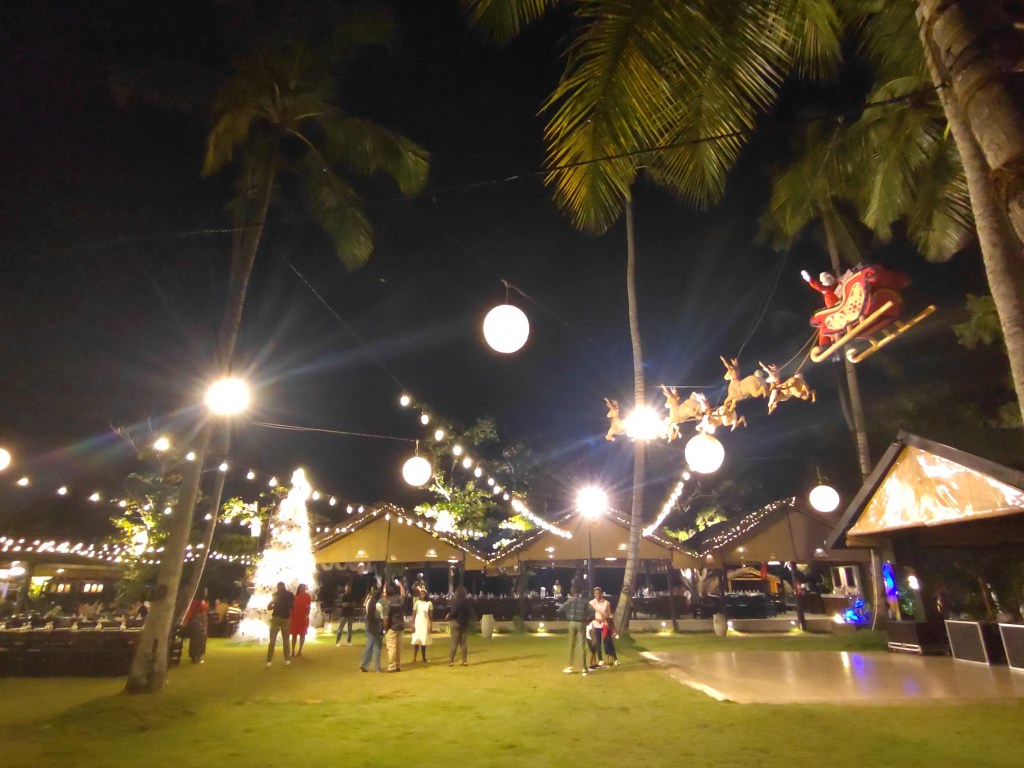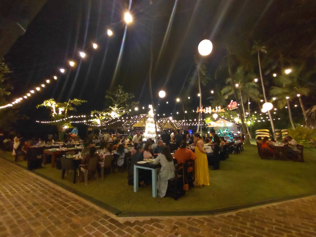 Let me begin with a bit about the ambience – we loved it. The vast area of well-maintained turf was neatly arranged with spaced out tables, and lit up with lines of whimsical hanging lanterns pulled out over the lawn. Being Christmas season, there was a fair bit of decoration as well, tastefully done in keeping with the modern yet rustic feel of the place. With the weather gods on our side, and a good playlist from the band, it was an absolutely perfect evening.