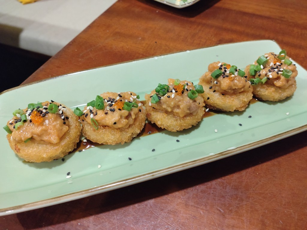 We tried a couple of dishes from their appetisers list, the first of which was Spicy Salmon & Crispy Rice (LKR 1,600). It looked enticing – eye-catching presentation. However, the salmon-mayo mix that sat atop the rice base was neither spicy, nor entirely fresh. The crispy rice base didn’t have the crunchy crispiness that we expected. Rather, it was quite hard and had absorbed a fair bit of oil from the frying process. There really wasn’t much flavour to it.