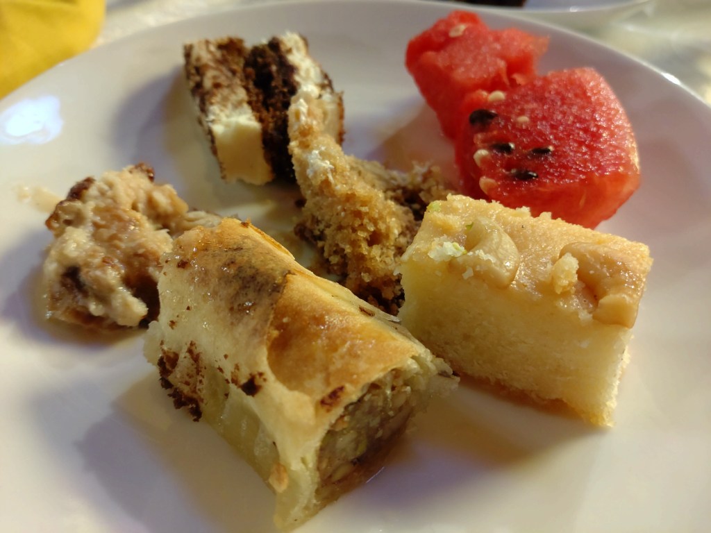 Among the usual international desserts, there were a number of sweet treats that were Mid East-influenced such as umm ali, basbousa, harissa and baklava. I was excited to see baklava in the mix, however, it wasn’t the flaky, crunchy, nutty texture that I hoped it would be. Perhaps the preparation was a more Greek-influenced recipe than Arabic-influenced.