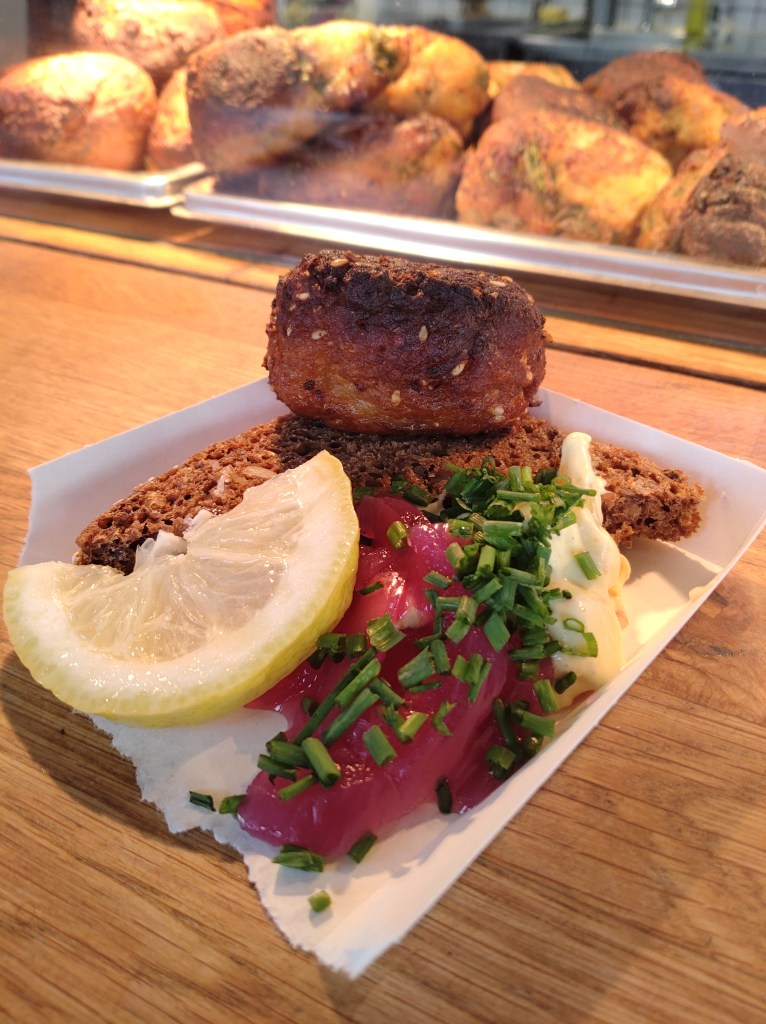 A short walk and some sight-seeing later, our next stop was Torvehallerne, a large indoor food market that offers local produce, as well as artisanal and gourmet food stuff. We started with some fiskefrikadeller (cod fish cakes) with rye bread, pickled turnip, a rémoulade and a wedge of lemon. The combination tasted really, really good. A proper winner.