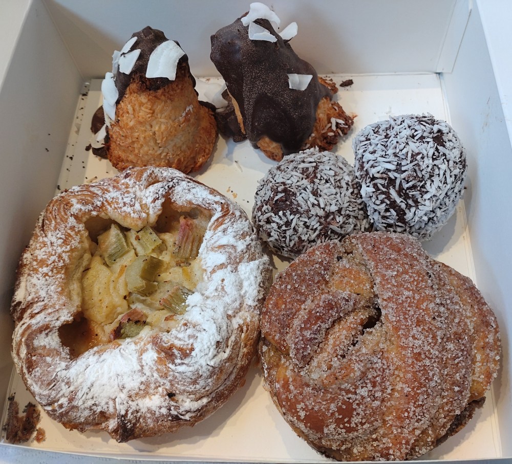 Next was a classic spandauer pastry (familiar in appearance to most, I’m sure), but with a filling that we don’t often come across – rhubarb. I liked the sweet and tart balance of it. There was also a cardamom snurre (knotted bun), which was a refreshing difference from the more common cinnamon bun, kokostoppe (coconut cake – see Malmö) with chocolate on top, and the rich, dense and not-too-sweet rumkugler (chocolate rum balls).